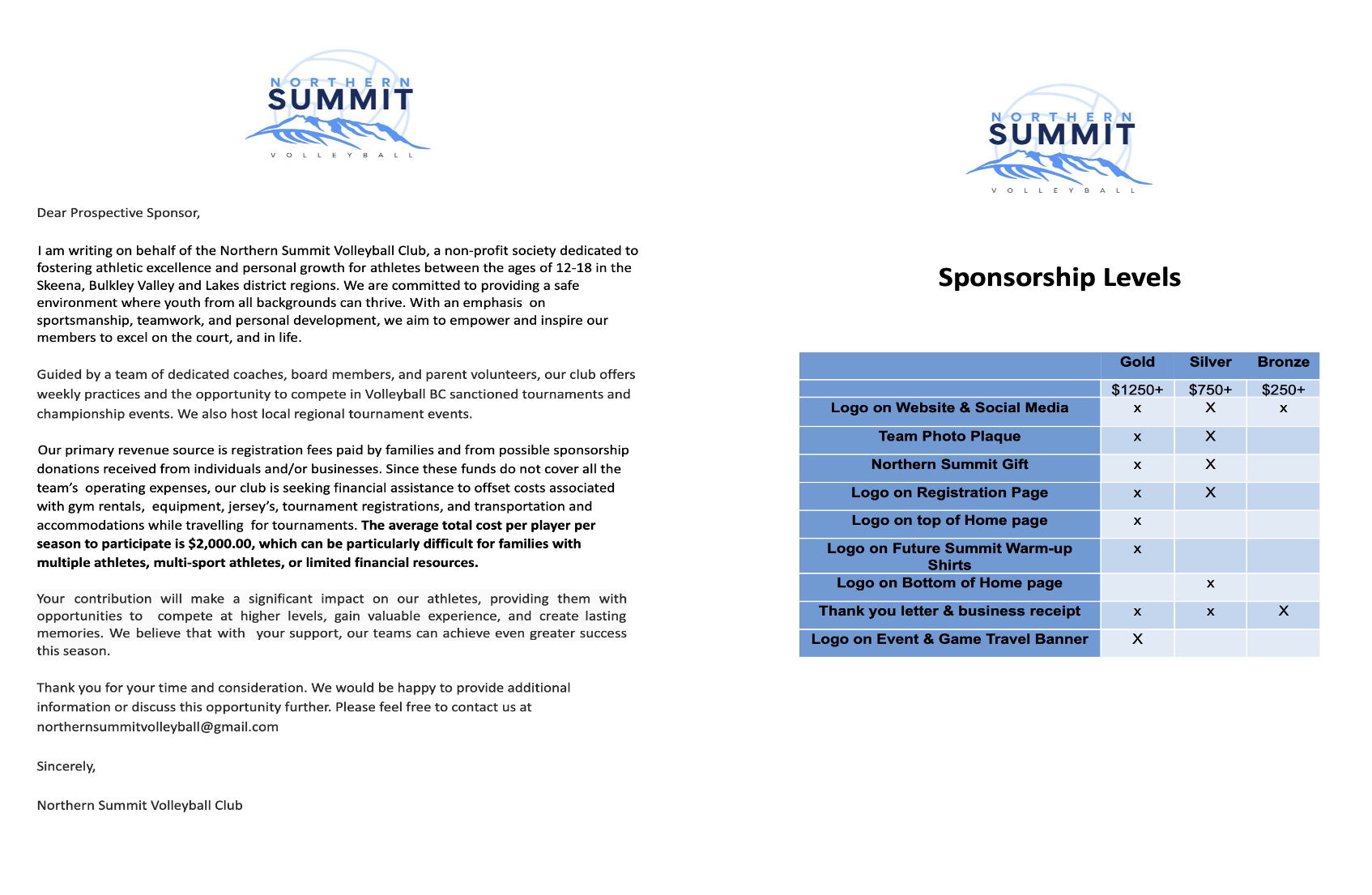 If you are interested in sponsoring Northern Summit Youth Volleyball Club,